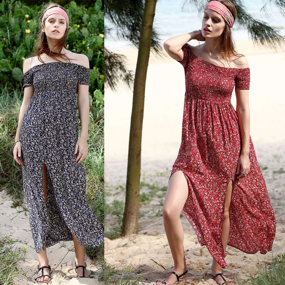 Bohemian Women Summer Dress Red blue Floral Boho Dresses Off Shoulder Long Beach Sexy Sundress Casua