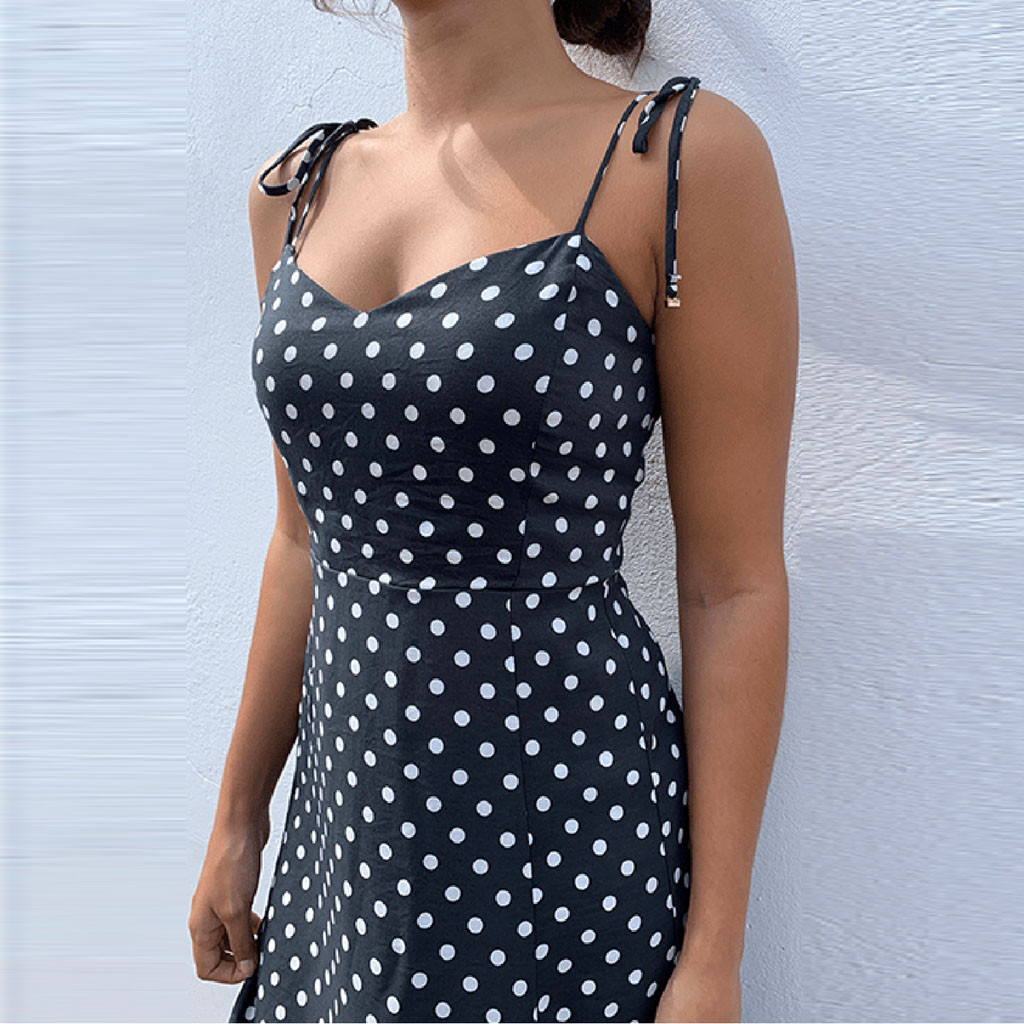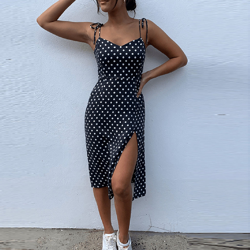 Fashion women ladies summer casual sleeveless sexy slim fitted knee length black polka dot dresses